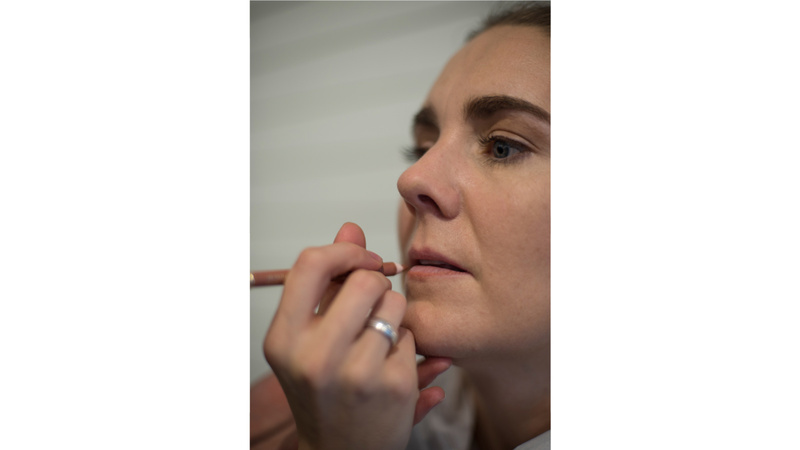 Pour les lèvres, prendre une couleur plus vive qui va avec les vêtements. D’abord l’appliquer avec un stylo puis un crayon pour dessiner le contour des lèvres et enfin au pinceau. La touche finale: un peu de blush sur les pommettes.